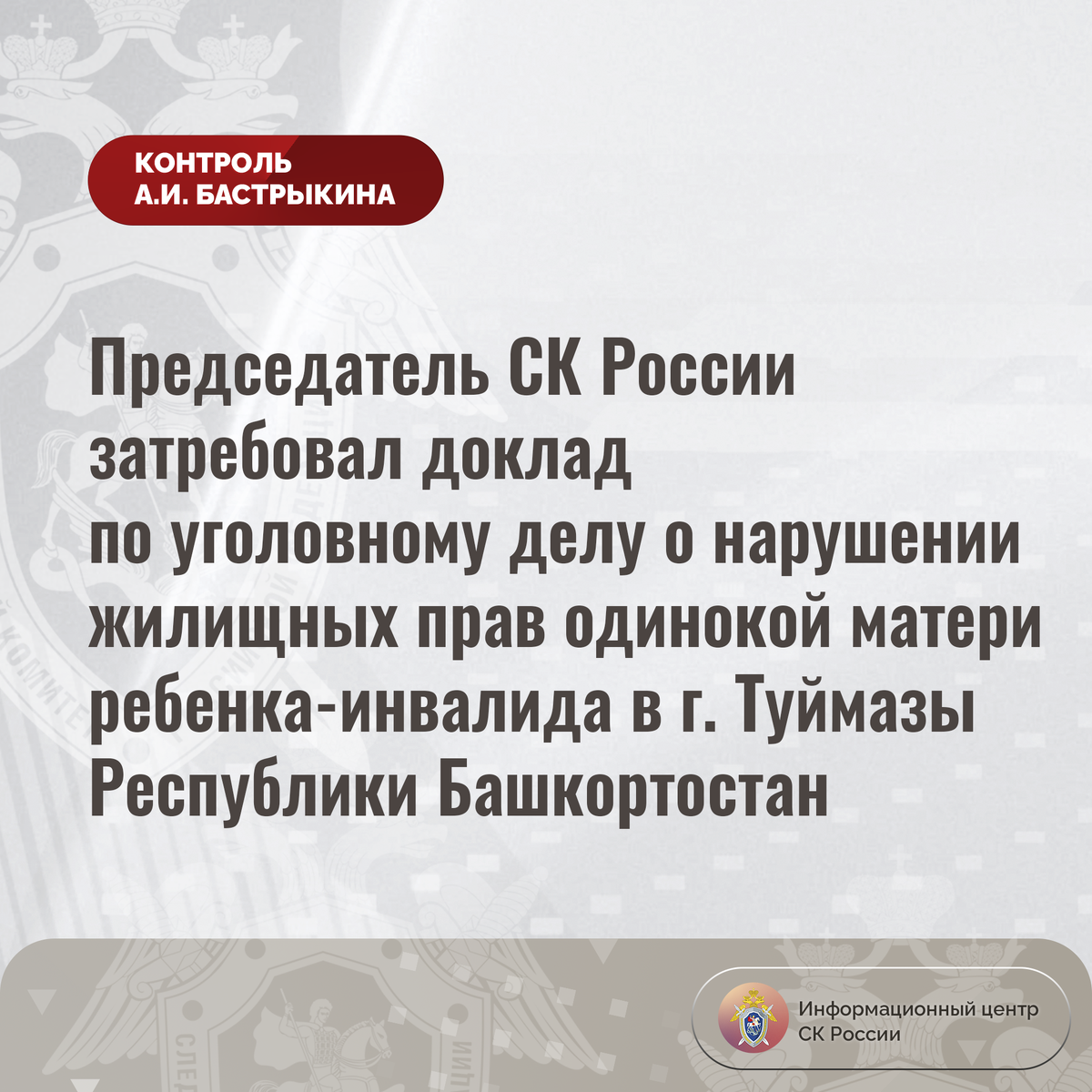 Председатель СК России затребовал доклад по уголовному делу о нарушении жилищных прав одинокой матери ребенка-инвалида в г. Туймазы