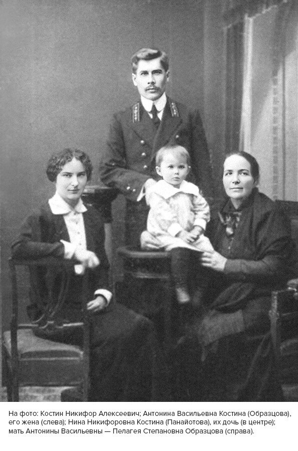 Дочь Никифора Алексеевича и его жены Антонины Васильевны Костиной (Образцовой) — Нина Никифоровна Костина-Панайотова (1913–2000 гг.) стала физиком, закончила физфак ЛГУ и работала заместителем заведующего лабораторией академика Линника в ГОИ.