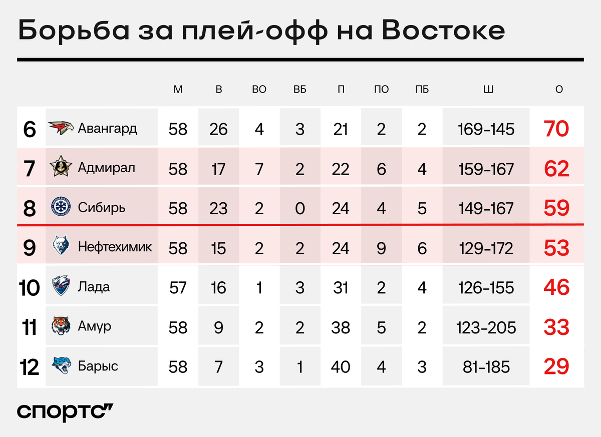 Хотя будет тяжело. «Адмирал» – главный парадокс нынешнего сезона: насколько мощны на домашнем льду, настолько же ужасны в гостях – до предпоследней выездной серии дальневосточники шли третьими с конца в лиге. Тамбиев вовремя настроил хоккеистов на борьбу: обыграли «Барыс» (4:2) и забрали важнейшие два очка у «Сибири» (5:2). Команда немного обезопасила себя в битве за плей-офф – на 9 очков оторвалась от девятого места. Но говорить о том, что все участники плей-офф на Востоке определены, пока рано. Да, пять команд уже точно сыграют в конце марта: «Трактор», «Автомобилист», «Ак Барс», «Салават Юлаев» и «Металлург». Следующим в списке будет «Авангард», у которого большой отрыв от преследователей. Но по оставшимся двум местам вопрос закрыт не до конца: у «Адмирала» и «Сибири» заметное преимущество перед «Нефтехимиком», но нижнекамцы – при идеальном прохождении оставшейся части регулярки – еще могут залезть в плей-офф. «Сибирь» могла усложнить жизнь «Адмиралу», но теперь надеется на него Мат