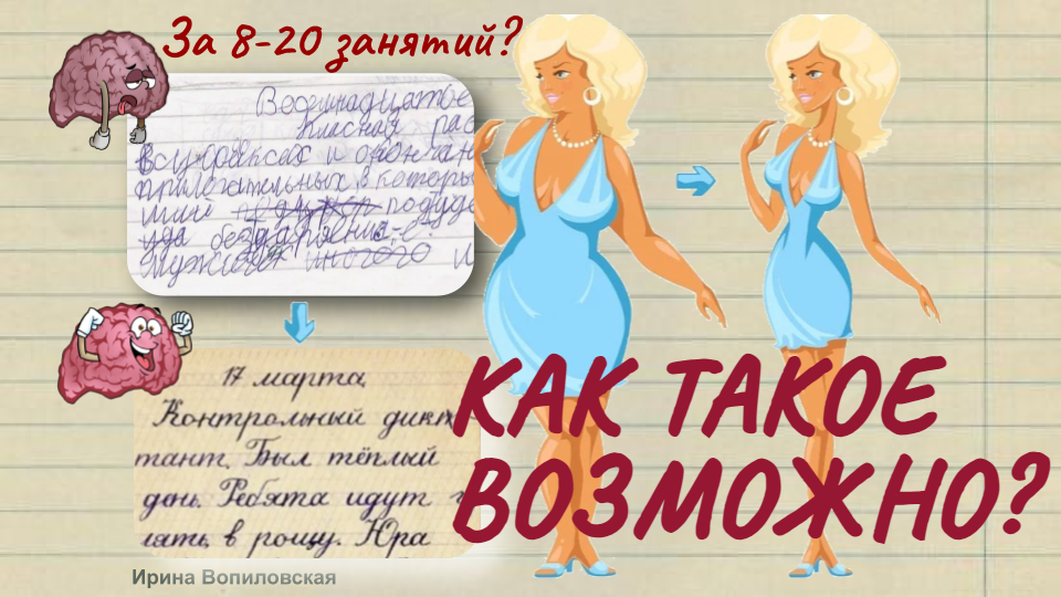Почему некоторые курсы по исправлению почерка не работают, особенно за 8-10-20 занятий? Речь не о том, чтобы чуть выровнять буквы и освоить правильные соединения, что похоже на возможность сбросить пару-тройку лишних килограмм. Речь об исправлении почерка, причина которого глубоко внутри организма - в мозге, когда и буквы в строчку не попадают, и зеркальность, и пропуски заглавных, обводки, грязь, недописанные слова или с повторами слогов.