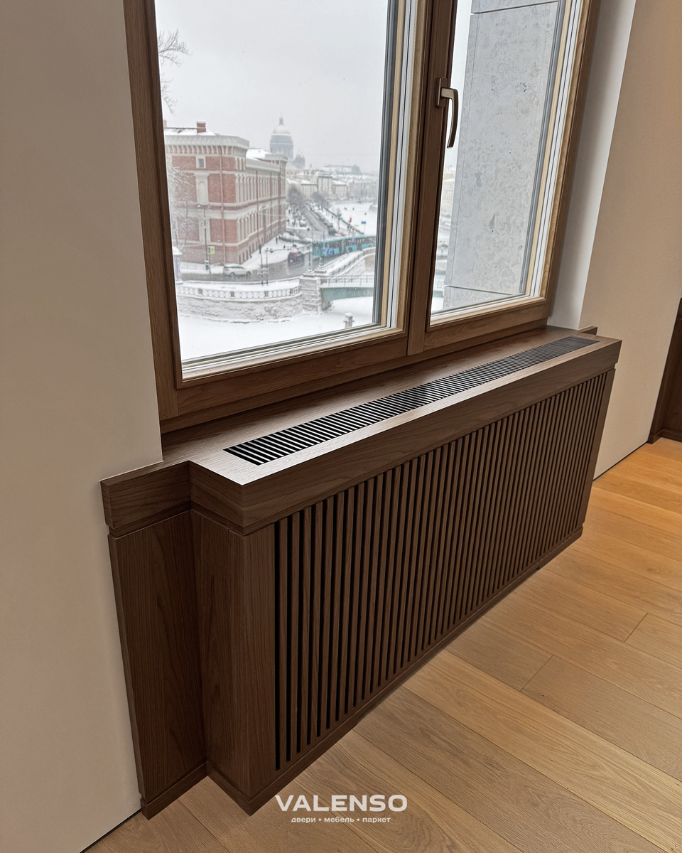 В этом интерьере каждая деталь проработана до мельчайших нюансов, и именно такое оформление радиаторов, делает пространство цельным. Экраны выполнены в натуральном шпоне ALPI, и это не просто декоративный прием — натуральная текстура шпона добавляет глубины, а геометрия фасадов поддерживает архитектурную логику помещения. Мы изготовили их на собственном столярном производстве, по проекту дизайнеров. На последнем фото видна стена в зоне телевизора, также оформленная нашими панелями в шпоне. Здесь отделка играет двойную роль: с одной стороны, она служит фоном для ТВ-зоны, а с другой — объединяет пространство, перекликаясь с текстурами мебели и другими элементами. Такая работа со шпоном требует особой точности: важно не только подобрать рисунок древесины, но и правильно разместить панели, чтобы они выглядели монолитно. Этот проект — пример того, как мебельные и столярные элементы могут не просто дополнять интерьер, а становиться его ключевой частью. Авторы дизайна интерьера: RYMAR STUD