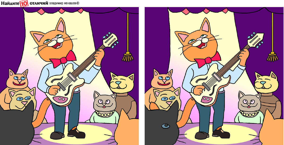 Друзья, сегодня у нас на рисунке для поиска отличий - кот с гитарой. Он дает концерт перед зрителями. Найдем все отличиия?