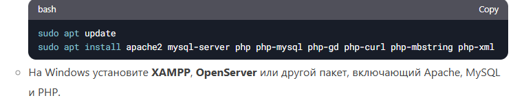 Дополнительные модули PHP: mbstring, gd, json, xml, mysqli, curl и другие (полный список в документации). - Установите необходимые компоненты: