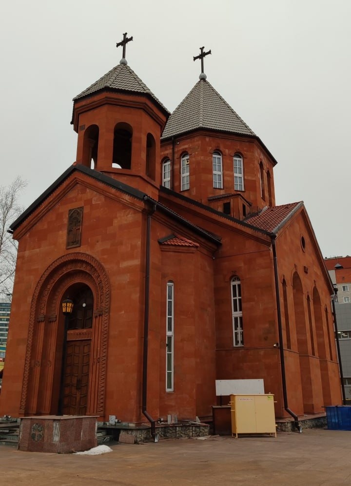 Армянская апостольская церковь в Кирове. Зимой 2024 года я посетил Армянскую церковь. Выглядит она как миниатюрный красный средневековый замок. Ранее я не бывал в таких церквях ни разу. Я зашёл туда совершенно случайно, проходя мимо по своим делам. Мне стало интересно, у меня было время и я решил не упускать шанса. Внутри никого не было, кроме бабушки в церковной лавке и молодого армянина, который с ней разговаривал. Я сначала изучил внутреннее убранство. А затем немного пообщался с вышеупомянутыми людьми. Как я понял, армянская церковь в целом относится к православной ветке церквей, но в то же время она отличается от них и живет обособленно, сама по себе. И в ней сочетается византийское православие и римский католицизм. Построена она, конечно, больше в католическом стиле и внутри я заметил классические скамьи, которые характерны для католических церквей, на которых сидят прихожане во время службы. А на куполах церкви также видны католические кресты, которые ко всему прочему обтянуты с