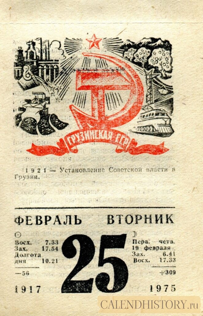 Итак, сегодня 25-го февраля и у нас на календаре 1975-й год. Перед нами листок советского календаря для женщин. На календаре у нас вторник - 25 февраля 1975-го года. ГРУЗИНСКАЯ ССР 1921 — Установление Советской власти в Грузии. *** Оборотную сторону листка этого календаря можно посмотреть у нас по ссылке на сайте. Другие листки советских календарей смотрите у нас на сайте - CALENDHISTORY.ru ПОСМОТРИТЕ ЕЩЁ ЛИСТКИ ОТРЫВНЫХ КАЛЕНДАРЕЙ: