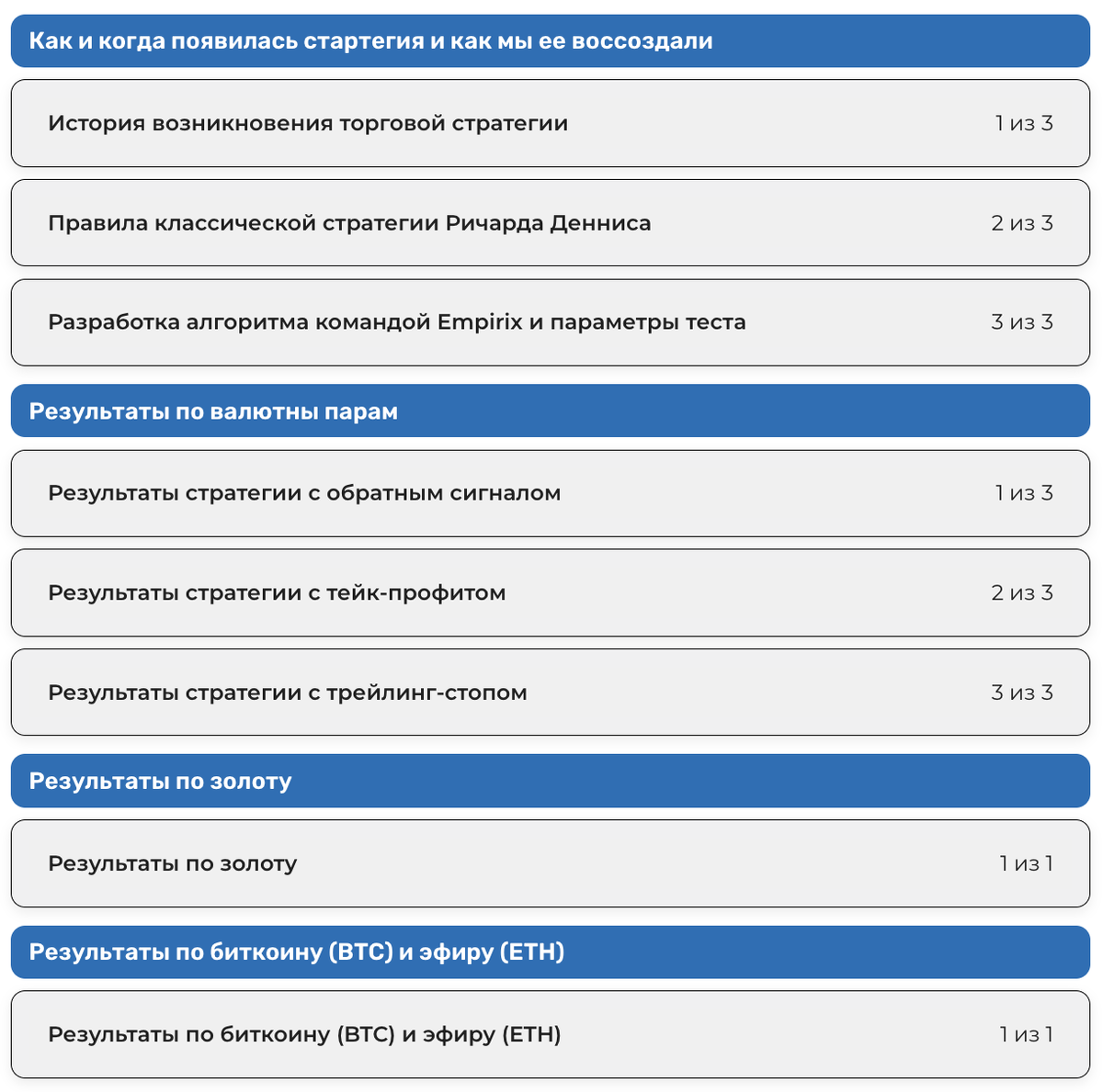 Большинство начинающих трейдеров теряются на старте: с чего начинать, какие стратегии вообще работают, и как не потерять депозит за неделю. Одна единственная стратегия не сделает вас успешным, к сожалению. В трейдинге важны портфели стратегий, а не идеальные одиночные разработки. Но с чего-то начинать всё равно нужно. Поэтому в бесплатный курс Начинающий трейдер мы добавили легендарную стратегию "черепах" Ричарда Денниса. И не просто рассказали её логику, а проверили на 31 инструменте — валюты, золото, биткоин и эфир. Материалы открываются не просто так. Если ещё не проходили курс, внимательно изучите его — ссылка будет в нужном месте.