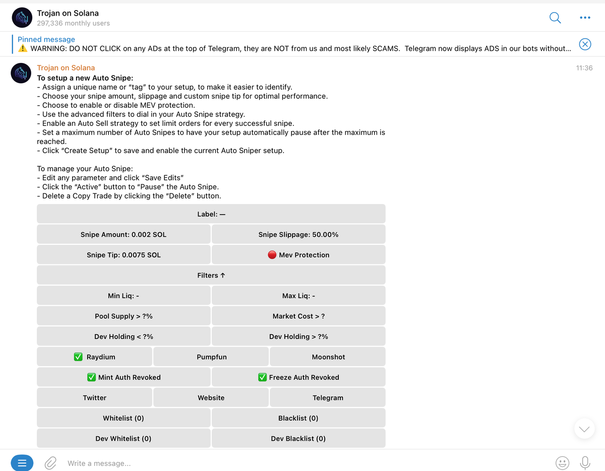 Для трейдинга мемкоинов нужны инструменты с высокой скоростью исполнения ордеров, возможность поставить тейк-профит, стоп-лосс, автоматизировать некоторые действия (так называемый снайпинг). Очень популярны Телеграм-боты для торговли. Туда можно загрузить нужный контракт и настроить параметры покупки-продажи, или держать окно телеграм рядом с самим графиком на DEX-бирже (пампфан, рейдиум и тд). Подписывайтесь на мой Телеграм канал про крипто и DEX-трейдинг — https://t.me/wedosidehustle. Платные и бесплатные инструменты, кошельки и лучшие KOL для копирования. Официальный сайт. Самый популярный телеграм-бот для торговли на Solana. Пусть вас не пугает название :) Бот показывает почти 300 тысяч ежемесячных пользователей. Известен своей высокой скоростью исполнения ордеров, что критически важно при торговле волатильными мемкоинами. Функции снайпинга: можно автоматически покупать токены при создании, до/после миграции с Pump.Fun. Часто упоминается как один из самых быстрых ботов на Solana