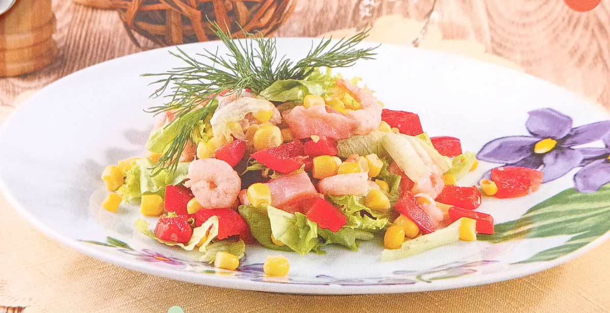 Креветки отварить и почистить. Рыбу порезать кубиками. Болгарский перец очистить от семян и порезать полосками или можно квадратиками. Зелень порубить. Смешать все ингредиенты, заправить маслом. Лук очистить и разрезать на 4 части , залить вином, довести до кипения, посолить , положить филе рыбы и после закипания варить 10 минут на слабом огне. Приготовить соус, яичный желток отделить от белка, перемешать с сахаром, горчицей, уксусом, растительным маслом и рыбным бульоном, посолить , поперчить. Отварное филе рыбы охладить и нарезать на кусочки. Помидор порезать кубиками ,смешать с кусочками рыбы и залить соусом. Оставить на 20 минут. Готовый салат выложить на листья салата, посыпать измельчённым белком и украсить укропом.