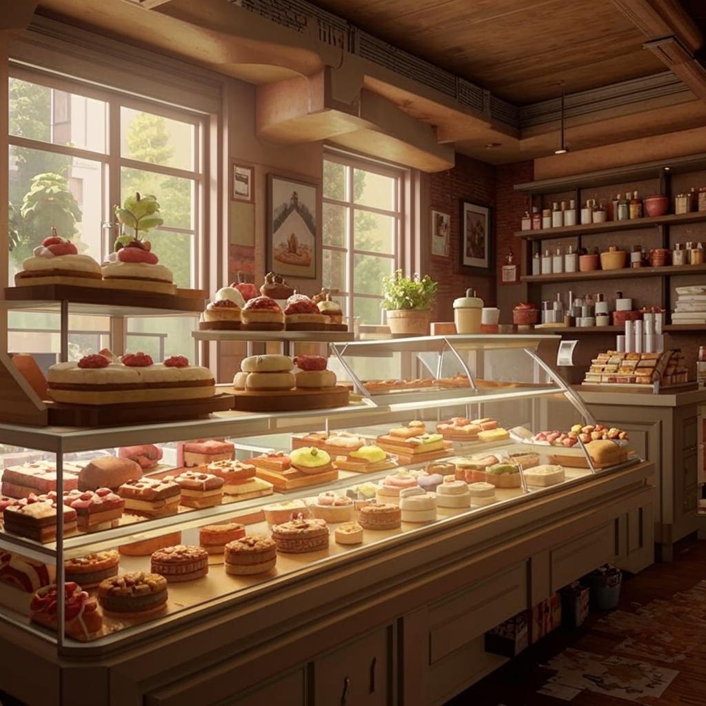 Вдоль стен стояли деревянные полки, заполненные коробками с конфетами, банками варенья и баночками с разноцветной посыпкой. В центре зала располагались стеклянные витрины, за которыми красовались настоящие шедевры кондитерского искусства: шоколадные торты с бархатистой глазурью, воздушные безе, пирожные с кремовыми розами и эклеры, украшенные золотой пудрой. Каждый десерт был аккуратно подписан: «Тирамису», «Чизкейк с малиной», «Шоколадный фондан», «Карамельный мусс». Воздух был насыщен ароматами свежей выпечки, ванили, какао и слегка уловимой ноткой корицы.