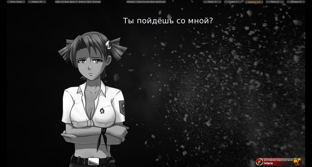 А как вы относитесь к этому персонажу? Поделитесь своими мыслями в комментариях. Мне не терпится узнать ваше мнение. В итоге я выбрал не Славю, а Алису. Напомню, это персонаж из "7 дней лета". В игре множество концовок. У Алисы есть основной рут, предлагающий семь или восемь вариантов финала, а также ветка радиоведущих, насчитывающая шесть или семь концовок.