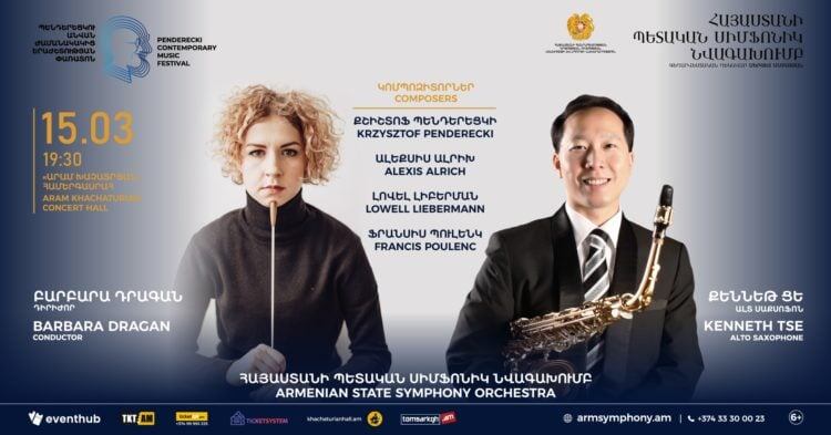 В Ереване пройдет вечер современной музыки, в ходе которого состоится мировая премьера концерта для альт-саксофона композитора Лоуэлла Либермана, сообщает Государственный симфонический оркестр Армении. Концерт в исполнении известного солиста-саксофониста Кеннета Це под руководством дирижера Барбары Драган пройдет 15 марта в 19:30 в концертном зале «Арам Хачатурян». В течение вечера прозвучат произведения композиторов Кшиштофа Пендерецкого, Фрэнсиса Пуленка и Алексиса Альриха. В программе: Кшиштоф Пендерецкий – адажиетто из оперы «Потерянный рай»(5 мин), Фрэнсис Пуленк – «Симфониетта» для симфонического оркестра (Allegro con fuoco, Molto vivace, Andante cantabile, Finale – 28 мин), Алексис Альрих – «Башни Колокола и Барабана» пекинские впечатления для оркестра (15 мин), Лоуэлль Либерман – концерт для альт-саксофона (Moderato, Lento, Molto Allegro – 20 мин). Концерт проводится в рамках пятого фестиваля современной музыки имени Пендерецкого. Вход для детей с 6 лет. Стоимость билетов от 3