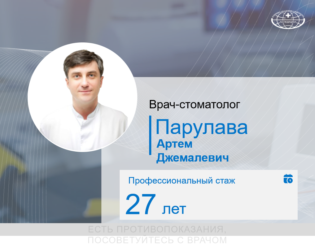 В клинике «АО Медицина» ведёт приём Парулава Артем Джемалевич — стоматолог с 27-летним опытом, член Европейского эндодонтического общество и Международной эндодонтической федерации.