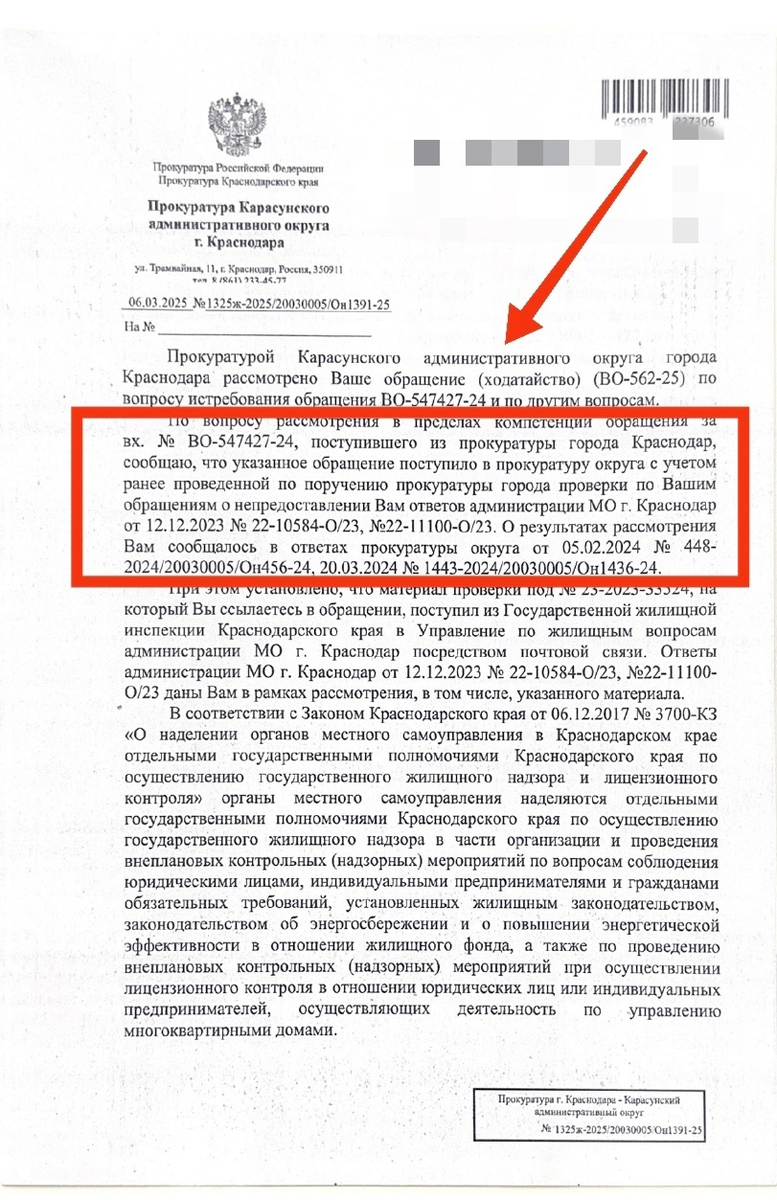 Сообщаю Вам, что 7 марта 2025 г. я, на свою электронную почту получил ответ прокуратуры Карасунского округа гор. Краснодара от 06.03.2025 №1325ж-2025/2003005/Он1391-25., в котором указана следующая информация: