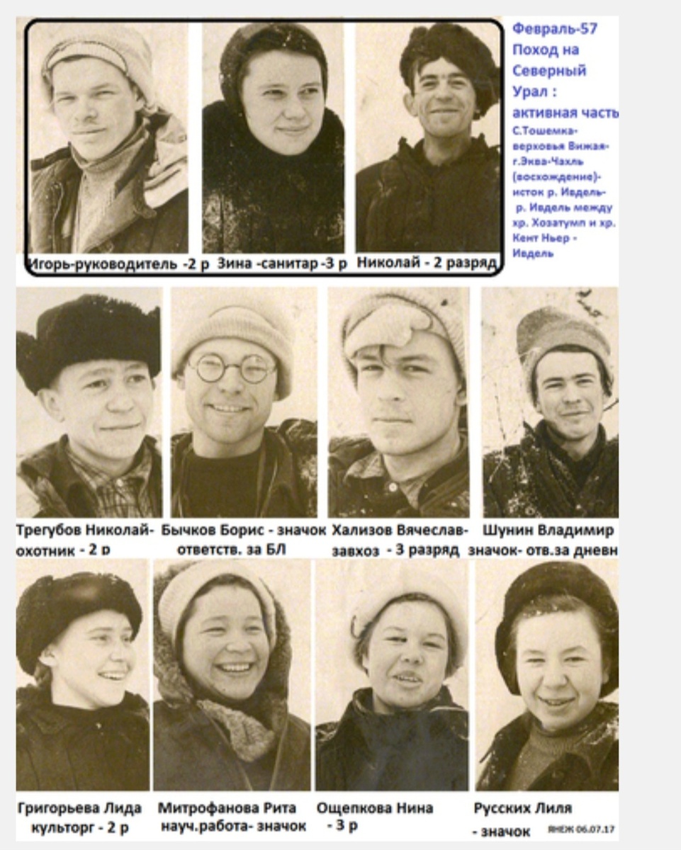 СОСТАВ ГРУППЫ [Все разряды указаны, почему в 59м с этим возникли проблемы (замечание Масленникова), не понятно. Может, разряды правда поменялись, и еще не все их сказали Игорю? Но то, что разряды должны быть указаны, Игорь, несомненно, знал. Новые вопросы - или этим Зина в 57м занималась (а может, кто-то еще), и (дотошный) Игорь упустил из виду разряды (вряд ли), или проект похода частично поменяли во время следствия. Или Масленников, как он и говорил, перед проектом просил получить новые разряды участникам и в момент подачи проекта еще не все доки были готовы по новым разрядам и была договоренность устная, что разряды уже новые в проект внесут и листик поменяют. А ребята черновичок этот с собой взяли, возможно, Масленников этого не ожидал.]