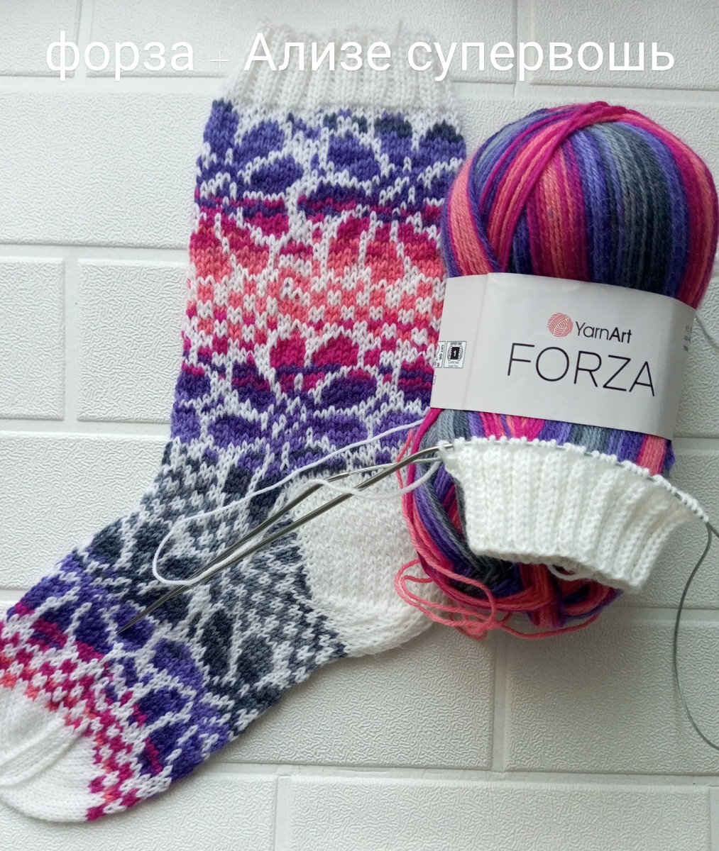 Пряжа Ализе супервошь белый, форза цветная, спицы 2 и 2.5