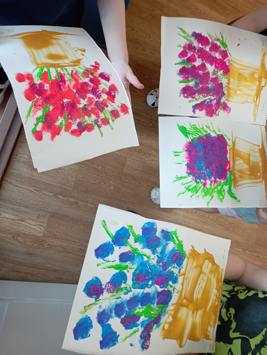 Всем доброго денёчка! Уже теплеет, солнышко греет, хочется цветочков. Вот с ребятами в детском садике решила сделать букетики. Правда взяла для этого акриловые неоновыекраски, чтобы быстро сохли и было очень ярко. Возник следующий вопрос: «чем рисовать?» Решила взять губки для посуды, разрезать на небольшие квадратики и чтобы дети не испачкались, прикрепить их на прищепки, и картонки, для того, чтобы нарисовать вазу. Всё отлично, к процессу готовы. Капаем краску на лист и размазываем картонкой, получается ваза. Пришло время губок на прищепках – берём несколько ярких красок, в моём случае это был алый, розовый и синий, опускаем кусочки губки в краску и примакиваем. После можно украсить букет листочками использовав небольшой кусочек картонки. Есть и ещё вариант, сначала наляпать спонжиками листочки, но в этом случае, есть вероятность, что юный художник не захочет дожидаться высыхания, и наляпает цветочки поверх зелёной краски…. Тогда получится новое волшебство – коричневый цвет…. Так