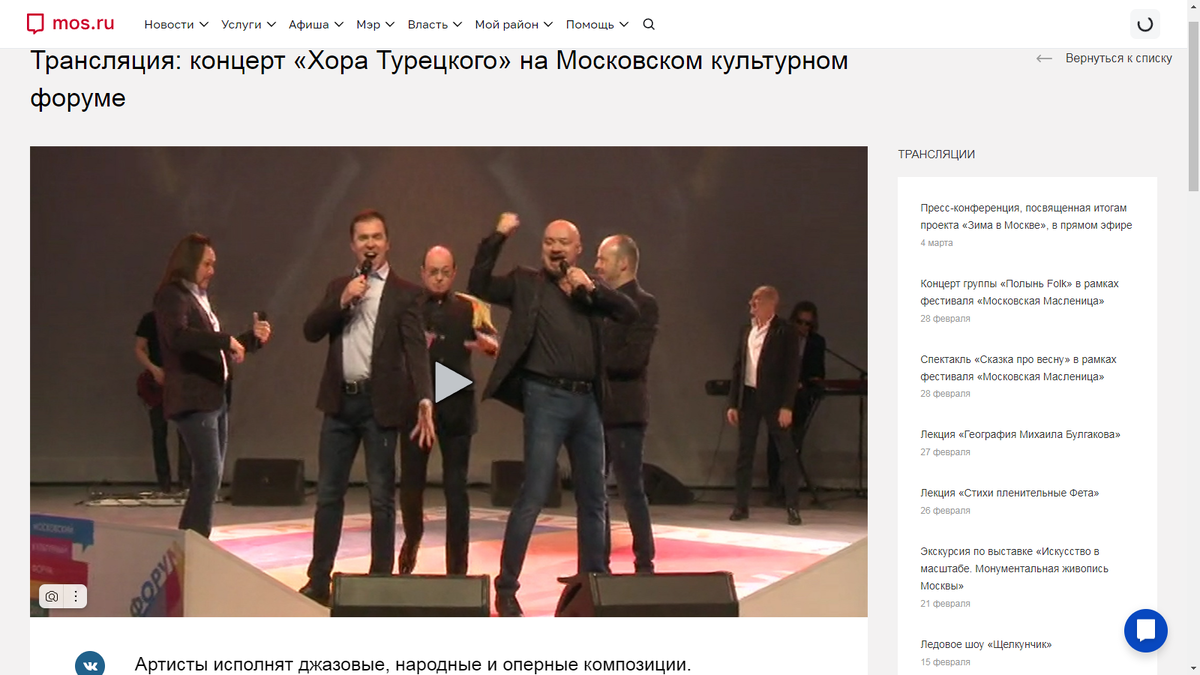 В современном мире, где всё происходит стремительно, не всегда удаётся посетить все культурные мероприятия, которые хотелось бы увидеть. Но специально для вас Департамент культуры города Москвы создал на портале mos.ru подборку лучших событий, которые можно найти на одной странице. — Как разнообразить свой досуг, не выходя из дома, вы узнаете в специальном проекте «Культура Москвы онлайн». Здесь вы найдёте множество событий из творческой и интеллектуальной жизни столицы, которые можно посетить онлайн. Уникальность этой онлайн-платформы в том, что она всегда открыта для доступа и трансляций всех событий. Вы можете смотреть видеоверсии спектаклей, концертов, лекций, встреч со знаменитостями, выставок, кинопремьер, виртуальные экскурсии по музеям и паркам и другие увлекательные мероприятия. 🎧 Прямо сейчас можно послушать Хор Турецкого: https://www.mos.ru/conferences/item/155296/; посмотреть балет "Сотворение мира" – классику отечественного и мирового балетного искусства: https://www.mos