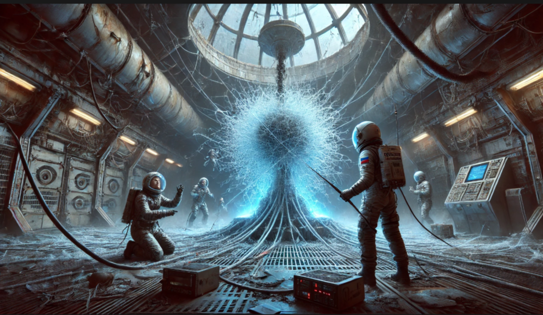 Светлана Ковалёва стояла в научном модуле "Зари-12", сжимая в одной руке монтировку, а в другой — сварочный аппарат, который уже начал дымиться от перегрева. Перед ней возвышался Борис Иванов — или то, что от него осталось. Его тело теперь напоминало жуткий гибрид человека и машины: руки покрывали металлические пластины, из груди торчали извивающиеся щупальца, а глаза светились голубым светом, слепящим, как прожектор. За её спиной Сергей Волков, бледный и дрожащий, прижимался к стене, бормоча что-то про "это не я" и "оно само". На столе между ними лежал вскрытый голубой цилиндр, подключённый проводами к компьютеру, который тихо гудел, выводя на экран непонятные символы.