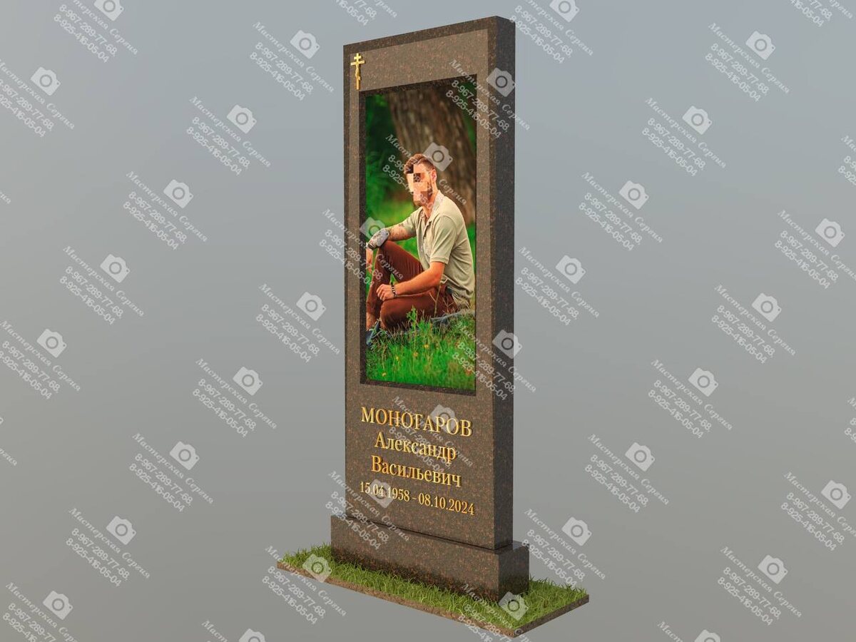 Почему важен электронный макет? Прежде чем приступить к изготовлению надписей, важно увидеть, как они будут выглядеть на памятнике, определить размер, расположение и пропорции. Именно для этого создается детализированный 3D-макет, который позволяет заказчику заранее оценить каждую деталь. На этом этапе мы подбираем размер букв, расположение креста и баланс всей композиции, чтобы памятник выглядел гармонично. Этот процесс помогает избежать ошибок и дает возможность заказчику утвердить идеальный вариант перед изготовлением. Строгая элегантность и долговечность Перед вами предварительный электронный макет памятника модель В-01, выполненный из темно-шоколадного гранита Дымовский. Его размер 200×80×12 см делает его выразительным и внушительным, подчеркивая уважение и память. В центре памятника будет установлен портрет из керамогранита 120×60 см, который проходит высокотемпературный обжиг, чтобы сохранить яркость изображения на десятилетия. Надписи выполнены накладным методом из нержавеющей