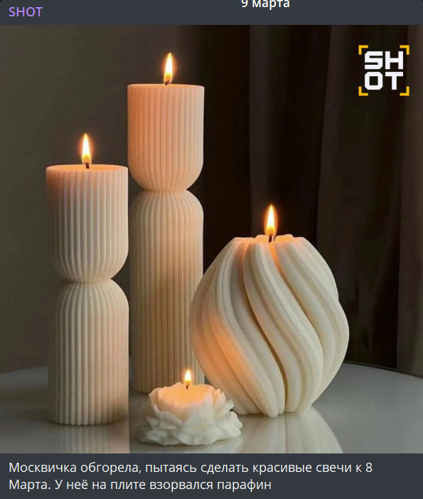Я до сих пор в шоке, честное слово. 67 лет прожила, борщи варила, пироги пекла, а тут — свечи! Решила, старая, в мастерицы податься, а в итоге чуть дом не спалила и себя в придачу. SHOT пишет, что я не первая такая умница, что парафин на плите топила, но мне от этого не легче. В голове крутится: «Зина, ну кто тебя за язык тянул? Сидела бы себе с вязанием, нет же, в огонь полезла, как мотыль на лампу!»