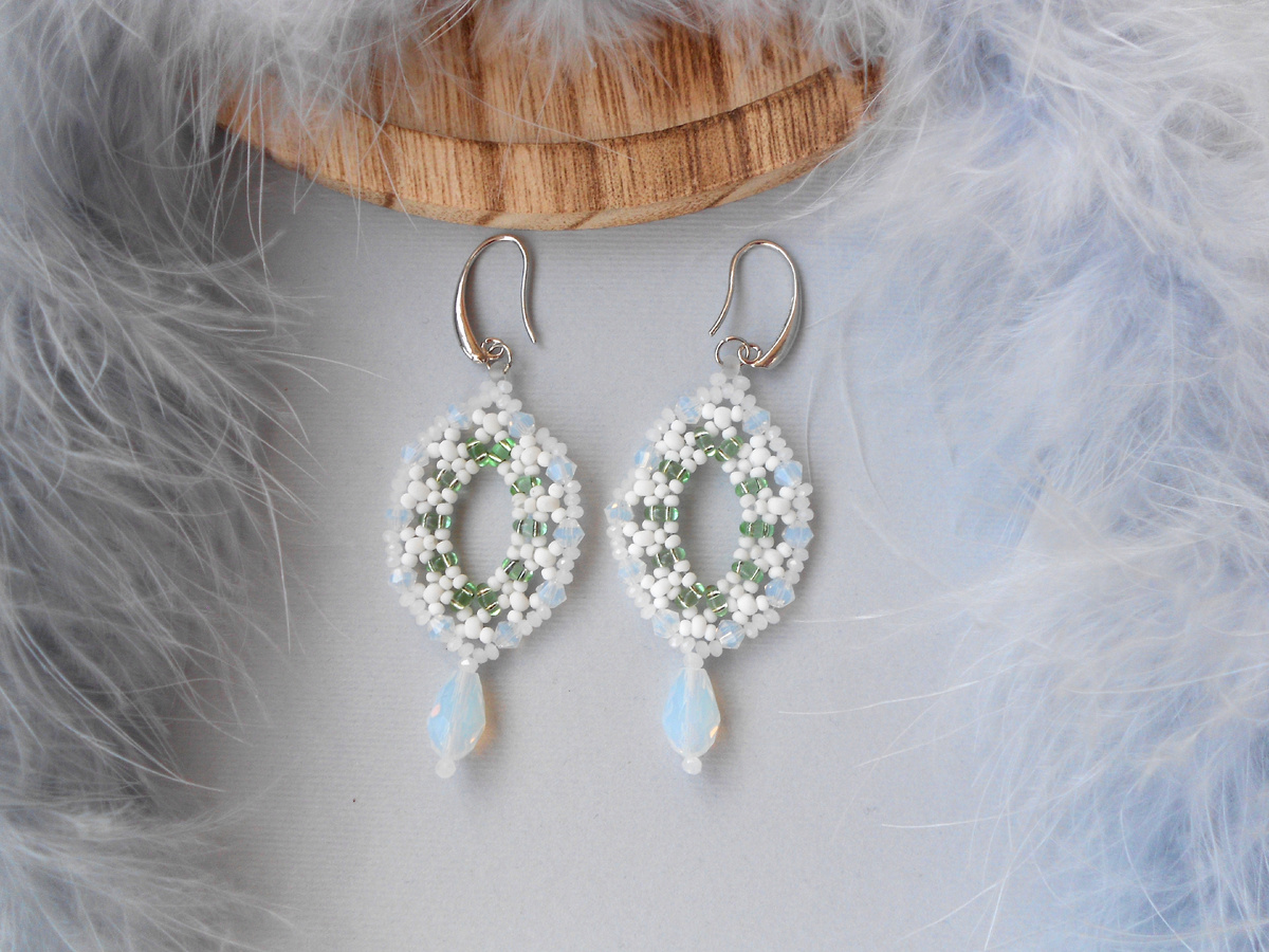 Продолжаем продолжать наше бисерное приключение. Сегодня я покажу вам как сделать серьги из бисера бусин и твина. Схема простая и понятная. Главное, чтобы были все необходимые материалы. Для создания серёжек потребуется Теперь можно приступать к работе! Набираем первый ряд как ниже показано на картинке: 1 твин; 2 бисеринки; 1 твин; 2 бисеринки; 1 твин; 2 бисеринки; 1 твин; 2 бисеринки; 2 твин; 2 бисеринки; 1 твин; 2 бисеринки; 1 твин; 2 бисеринки; 1 твин; 2 бисеринки; 1 твин. Соединяем в кольцо и завязываем узел Выводим леску через нижнее отверстие твин и 1 бисеринку. Набираем 2 бисеринки и проводим через верхнее отверстие бусины твин, образуя полукруг. Теперь нужно набрать 1 бисеринку 10 размера; 1 бисеринку 8 размера; 1 бисеринку 10 размера. Проводим нить между твином верхние отверстия. Леска должна выходить из верхнего отверстия твина. Набираем 2 бисеринки и вплетаем их, как показано ниже. Набираем 1 бисеринку 8 размера и 1 бисеринку 10 размера. Проходим через верхнее отверстие тви