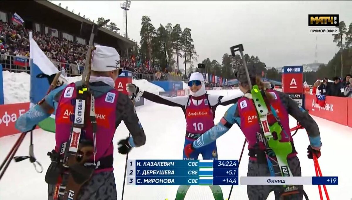 Ирина Казакевич одержала победу в масс-старте на Кубке России 1. Ирина Казакевич - 34.22,4 (1) 2.Тамара Дербушева - +5,2 (0) 3.Светлана Миронова - +14,5 (0) Очередной «случайный» подиум у Казакевич. Кучно пошли случайности. Теория вероятности нервно курит в сторонке и стыдливо опускает глаза. А что ей еще делать, когда такое количество случайностей происходит одна за другой? А если серьезно, то Ира просто (а точнее ой как непросто) стабилизировала стрельбу. Один промах на 4 рубежа, и ноги вдруг вновь понесли как прежде. Нашел-таки Шашилов ключик к своей любимой подопечной. Что-то такое сделали девушки на сборе в Сочи, что теперь при виде Казакевич воробьи не дрожат от страха. Я думаю, что помимо подтягивания физического состояния наконец-то нашли психологический баланс. Плюс, победа в индивидуалке, гонке, где как раз важна меткость, добавила Ирине уверенности. Да, тогда от части действительно повезло с габаритами, но теперь уже такого нет. Есть чистая работа опытной спортсменки, кото