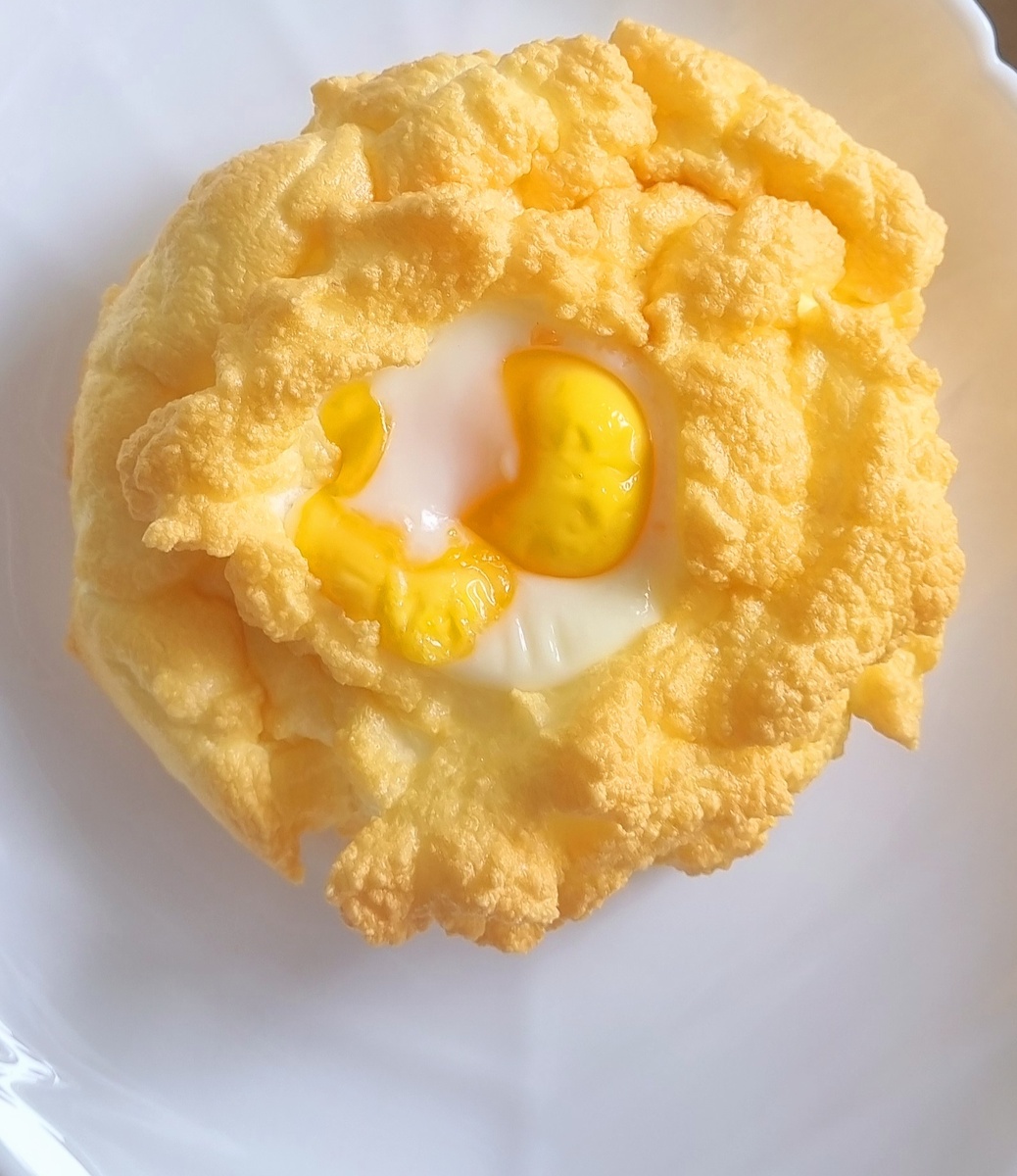 Такие яйца были в моем недельном меню запланированы аж две недели назад. Но что-то пошло не так и я их тогда не сделала, а вот вчера утром было и вдохновение и время и я решила их все же приготовить. Ходила я вокруг них с опаской, боясь того, что не получится. Тут же надо взбивать! Но вроде бы получились) Сейчас расскажу как их делать. Ингредиенты: Здесь вообще минимальное количество продуктов используется)) Итак, отделяем желтки от белков. Желтки каждый оставляем в скорлупке, порционно так сказать)) Белки с солью взбиваем до крепких пиков. На противень выкладываем три облачка, в середине каждого делая ложкой выемку. Ставим в разогретую до 180 градусов духовку на 4-5 минут. После в каждую выемку выливаем осторожно по желтку и отправляем назад в духовку еще на 4-5 минут. Вот так это получается после Моя работа над ошибками: Желтки нужно как отделять осторожно чтобы желток остался целым, так и выливать нужно осторожно, чтобы он не убежал, как у меня справа, поэтому углубление делаем погл