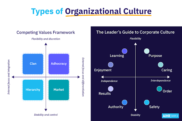 Согласно структуре конкурирующих ценностей Кэмерона и Куинна (CVF), существует четыре основных типа организационной культуры: адхократическая культура, клановая культура, иерархическая культура и рыночная культура.