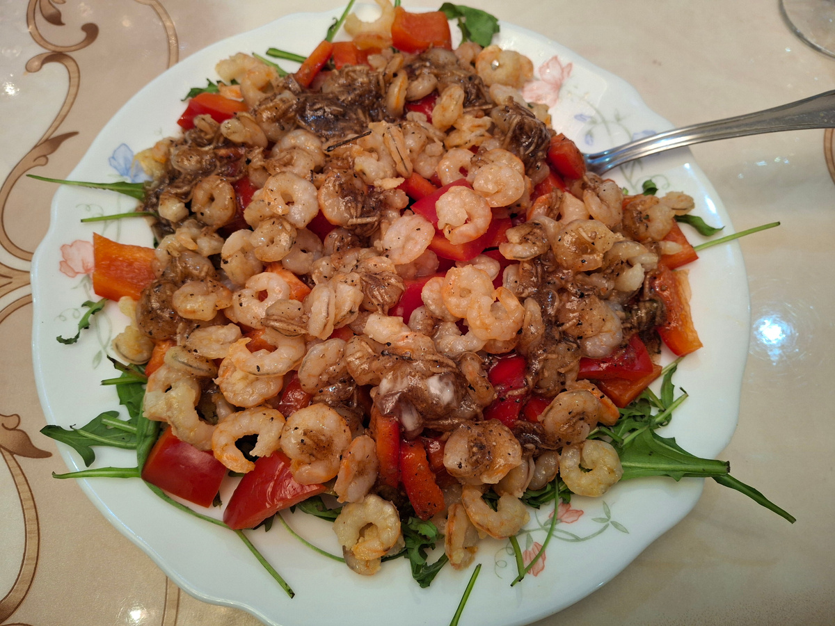 Состав: 400 гр. креветок очищенных; 1 щепотка соли; 20 гр. сливочного масла; 50 гр. рукколы; 1 шт. авокадо; 1 шт. сладкого перца; 2 ч.л. соевого соуса; 3 ст.л. оливкового масла; 1 щепотка соли; 2 щепотки черного перца; 2 зубчика чеснока. Приготовление: На разогретую сковороду выкладываем масло и креветки. Лучше достать их из морозильной камеры заранее и на ночь оставить в холодильнике. Обжариваем помешивая на сильном огне (на слабом начнут вариться а не жариться), до золотистости. Креветки конце посолить. Оставить остывать. На тарелку (можно подавать порционный или на общую тарелку) выкладываем рукколу. Авокадо разрезаем пополам, удаляем косточку, вынимаем мякоть и нарезаем, не мельчите. Перец чистим и нарезаем кубиком. Сверху на рукколу выкладываем авокадо. Затем слой сладкого перца. И выкладываем остывшие креветки. Делаем заправку. Смешиваем соевый соус, масло, соль и выдавливаем чеснок. Поливаем салат. Готово. Приятного аппетита!!