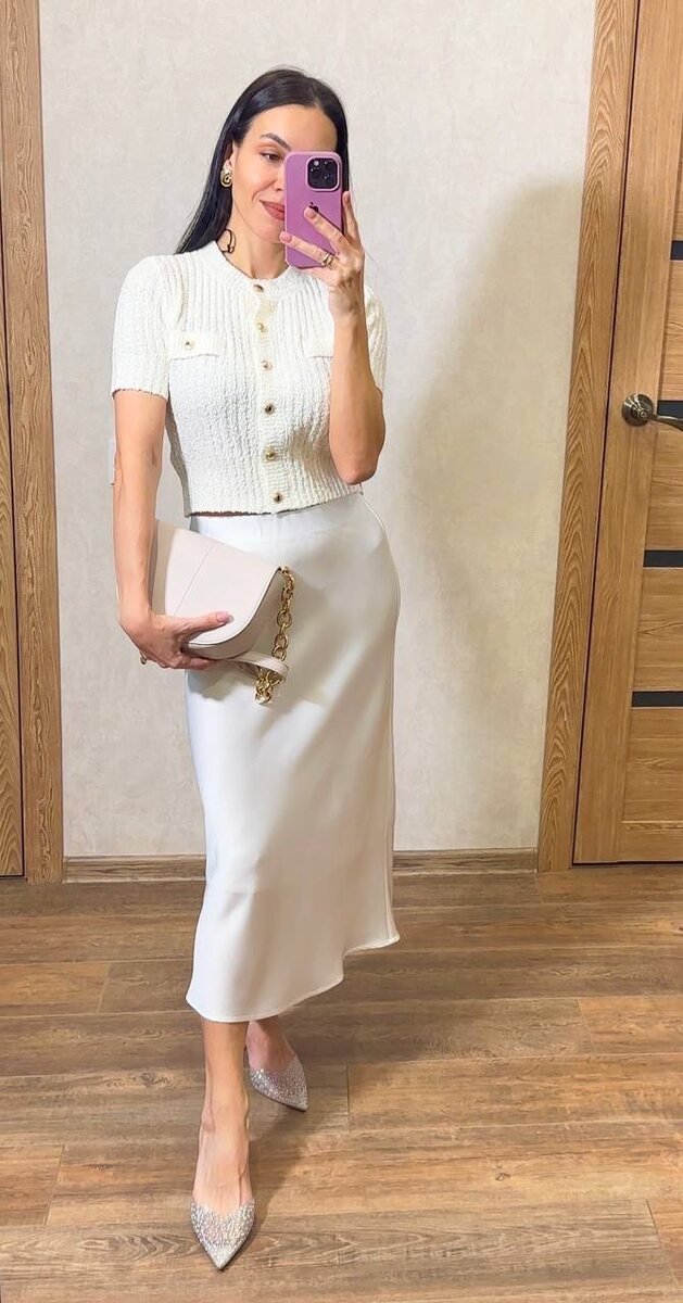 Нежно смотрится с шелковой миди юбкой и с брюками. С голубыми джинсам получается стильный и современный образ для любого случая. С черными низами образ получается строже, более деловой, а с белыми брюками - дорого, в стиле Олд Мани.