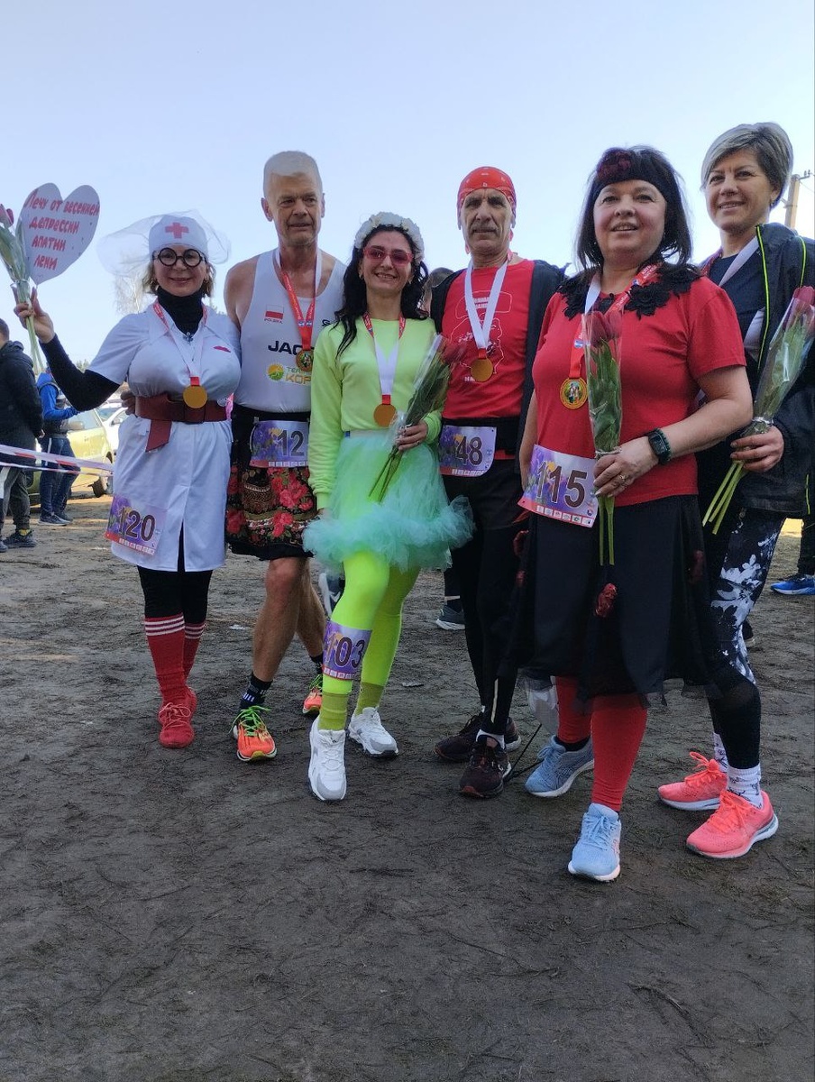 В костюме доктора. 😉 А вместе со мной (или я с ними) ещё больше 100 человек. А так как у нас в гостях были мои любимые барышни (внучки), то их и мужа я тоже потащила в лес. Будет, что вспомнить! Например: наша бабушка была немножко ненормальной, но это было весело! У нас в Калининградской области есть город Светлый. А там беговое сообщество уже лет 7-8 устраивает забег "Весна! Цветы! Любовь!" именно 8 марта. Забег проходит по лесу. Дистанции на 4 и 8 км. Дистанция на 8 км в форме восьмёрки. Видите какие затейники! ⬇️ Естественно, не заблудишься. Естественно, везде на маршруте были указатели и волонтёры из подростков-спортсменов. Бежишь себе по весеннему лесу и кайфуешь от свежего воздуха, природы и тишины. Всех бегунов, которые меня обгоняли, я спрашивала: - Всё нормально? Скорая помощь не нужна? Они, конечно, смеялись и отказывались. Но потом, после финиша все хотели со мной сфоткаться. Высокий мужчина - спортсмен из Польши. Как видите, все дружелюбны, никто никого не бьёт