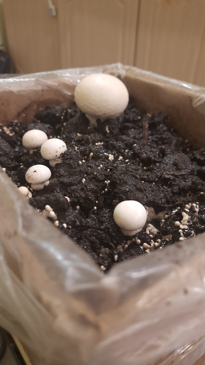 Недавно я увидела в интернете интересный вариант подарка для огородников/грибников и просто любителей необычных презентов. Это готовый набор для выращивания шампиньонов. В ролике девушка рассказала, как купила этот набор и буквально за пару недель у неё созрел хороший урожай грибов. Я загорелась и тоже заказала себе набор. Через несколько дней ко мне приехала коробка. В ней оказалось два пакета, в большом - грунт с мицелием (грибницей), в маленьком - питательная смесь из торфа и навоза. Ещё в коробке лежала подробная инструкция по выращиванию грибов. Первую неделю я дважды в день усиленно опрыскивала из пульвиризатора грунт с грибницей, наблюдая, как она прорастает. Важно именно опрыскивать, а не поливать землю, иначе можно просто размыть грибницу. Когда земля покрылась белым “мхом”, я высыпала на неё второй пакет и продолжила увлажнять. В положенный срок “охладила” свою коробку на балконе. Это нужно, чтобы грибы появились быстрее. Но мои грибы всё не росли. Я уже почти отчаялась, в