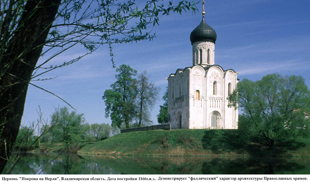 Скажем ещё несколько слов о варягах. В Новгородской первой летописи есть такая запись: «6650 (1142) Въ то же лѣто приходи Свьискѣи князь съ епископомъ въ 60 шнекъ на гость, иже изъ заморья шли въ 3 лодьях; и бишася, не успеша ничто же, и отлучиша ихъ 3 лодьѣ, избиша их полутораста». Здесь говорится, что на новгородских купцов напали шведы на 60 судах «шнеках», убили команду и отобрали лодьи. Далее через 10 лет идёт такая запись: «Въ лѣто 6660 (1152) апреля 23, загорѣся церкы святого Михаила въсредь търгу, и много бысть зла; и погорѣ всъ търгъ и двори до ручья, сѣмо до Славъиа, и церквiи съгорѣ 8, а 9-я Варязъская». То есть в это время новгородцы отличали шведов от варягов. Шведы занимались разбоем, а варяги ещё приезжали в Новгород торговать. У них там была своя церковь, чтобы было где помолиться. Эта церковь была католической, потому что все варяги в 972 г. были крещены по римскому католическому обряду. Но, не смотря на появившиеся различия в религиозных обрядах, варягов ещё свободно пускали в Новгород, воспринимали их, как своих. В отличие от «Свьискѣи князь съ епископомъ въ 60 шнекъ». Это ещё раз показывает, что по торговому пути «Из варяг в греки» ходили не шведы, а славяне – варяги. Здесь приведено фото церкви "Покрова на Нерли", дата постройки которой соответствует обсуждаемому периоду истории - 1166 г. н.э.. Церковь демонстрирует "фаллический" характер архитектуры Православных храмов.