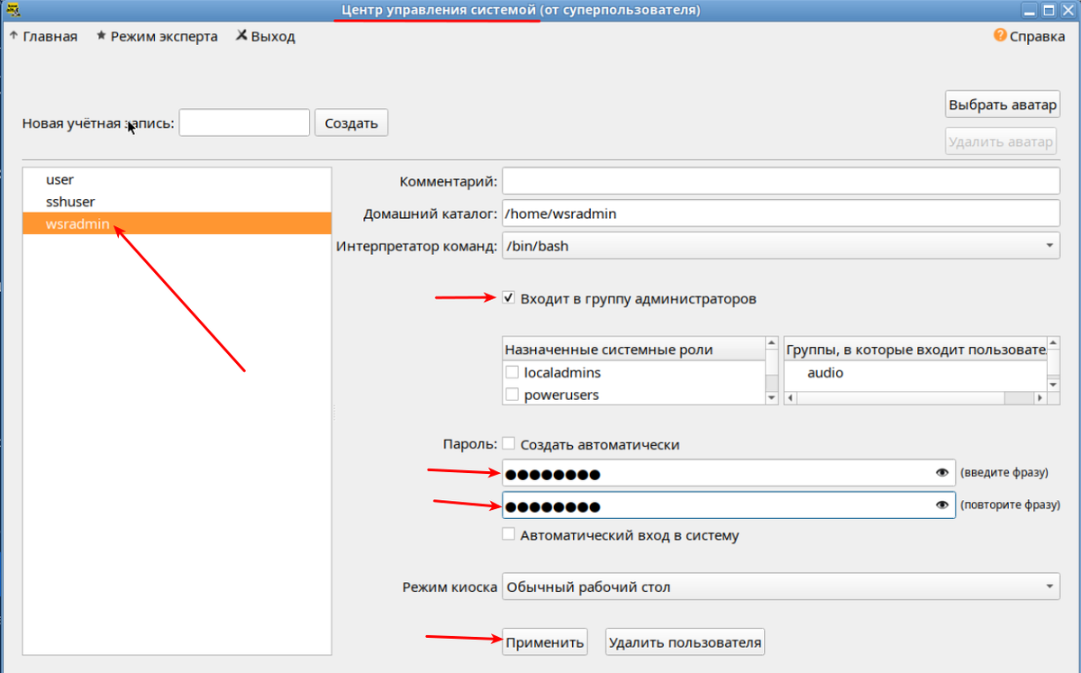 Создаём пользователя wsradmin с паролем P@ssw0rd на уровне ОС: Создаём отмел wsr: Добавляем пользователя wsradmin в отдел wsr с правами администратора: Реализуем возможность для доступа в веб-интерфейс управления из под данного пользователя: