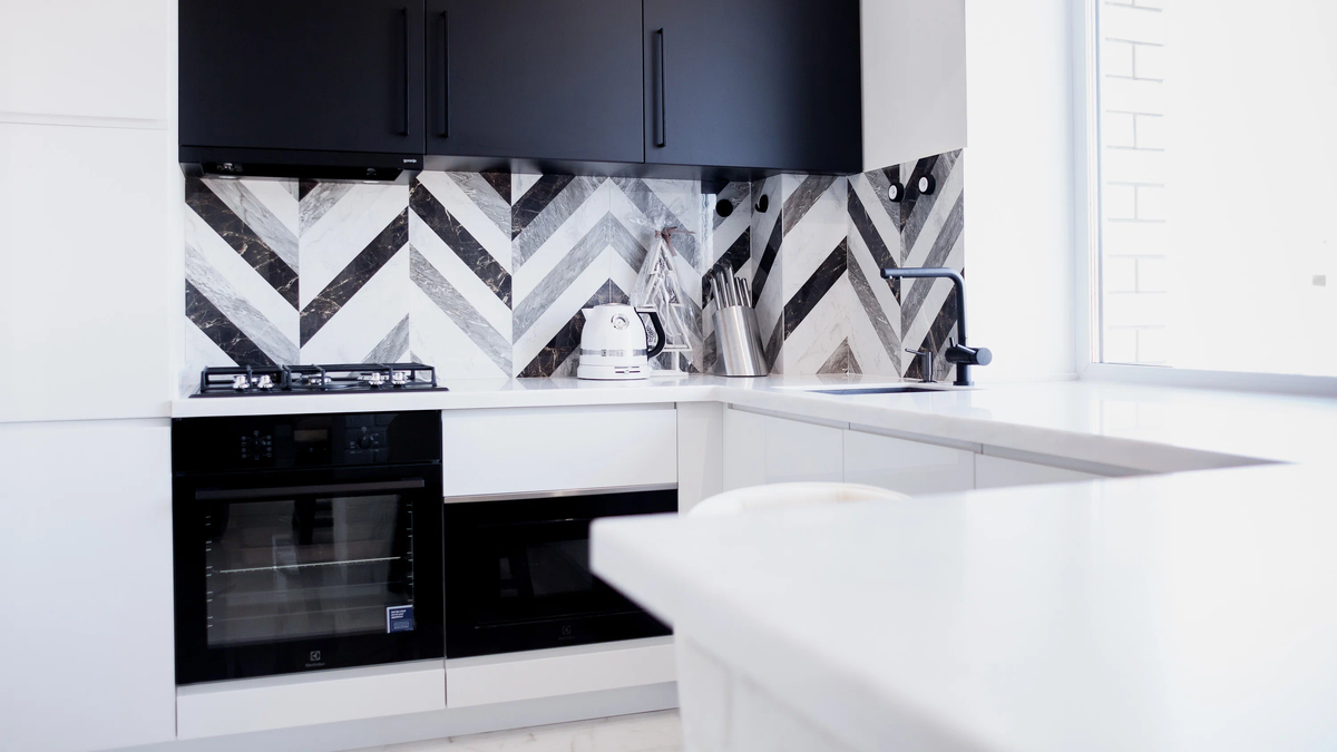 Для оптического и физического расширения пространства на этом проекте я использовала встроенную мебель. Придумала единую столешницу, переходящую в полубарный стол-стойку, перенесла мойку к окну, спрятала в нишу холодильник. Чтобы визуально увеличить кухню, придумала панно из вертикальных зеркальных полос, каждая из которых оформлена фацетом.