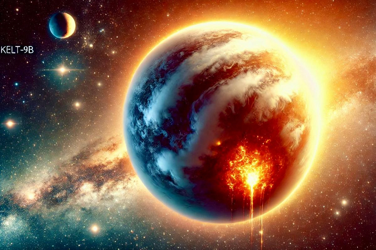 KELT-9b — это газовый гигант, который вращается вокруг звезды KELT-9, находящейся в созвездии Лебедя. Эта звезда в два раза горячее Солнца, что превращает ее планету в настоящий космический ад.