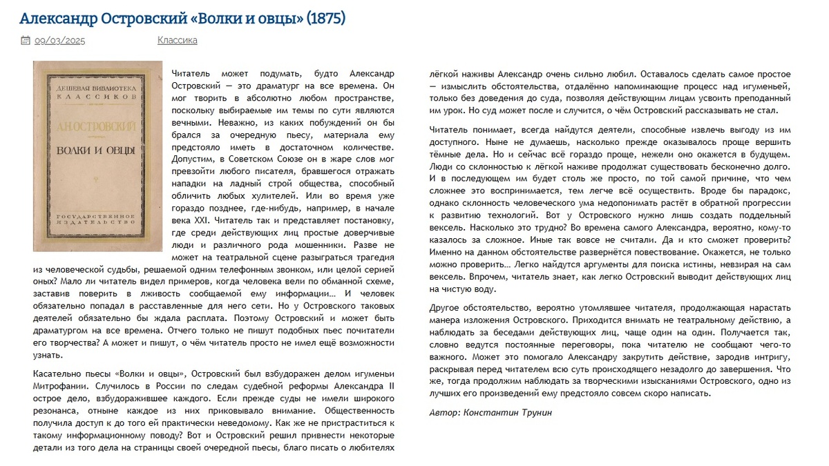 Александр Островский «Волки и овцы» Критика