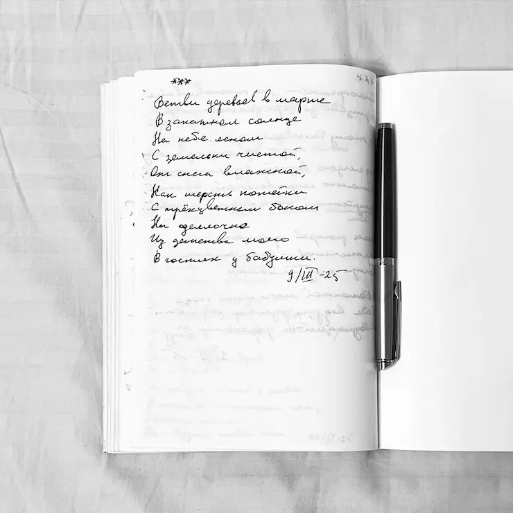 Ветви деревьев в мартеВ закатном солнцеНа небе ясномС земельки чистой,От снега влажной,Как шерсть котейкиС трехцветным бокомНа одеялочкеИз детства моегоВ гостях у бабушки.