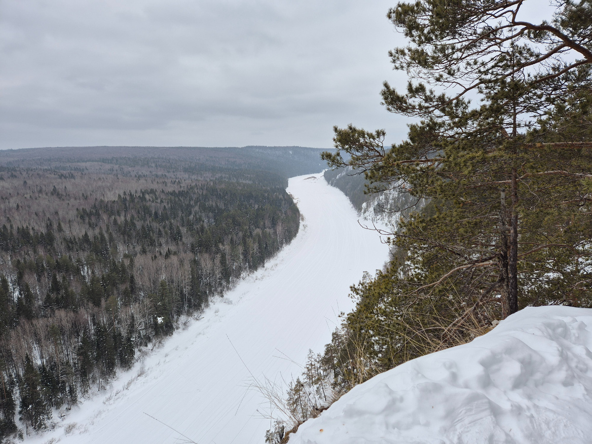 Эти места - просто песня. Поют ее весенние птицы, ветра в кронах, щели в скалах, говорливая река, а вместе сними и душа поет. И под эту песню шагается веселее - так и хочется бежать, раскинув руки, навстречу скалам, тайге и холмистым просторам. Тропа приводит нас к уже знакомой видовой точке. Под ногами разверзается стодвадцатиметровая пропасть - сначала резким обрывом, а к реке выполаживается. За рекой распростерлись всхолмленные лесные дали. Лес синеет, нахмуривается и к горизонту сливается с серыми непогожими облаками. Справа река, делая изгиб, прячется за холмом. На склоне этого лесистого холма приютился деревенский домик, дальше всех забравшийся от своих бревенчатых односельчан. И что это за село! Побывав там однажды, уже лишь при одном только слове Кын начинаешь слышать потрескивание дров в печке, лай собак и скрип полозьев по снегу, ну а если дать волю фантазии, то может даже послышаться шум весенней суматохи на причале, предвещающий скорое отбытие барок в дальние края. Если