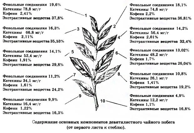 Вторая картинка показывает химические изменения в чайном листе на разных стадиях его переработки по технологии чёрного чая.