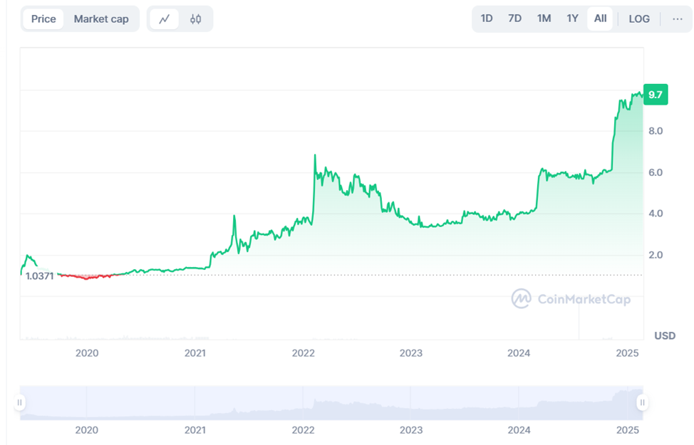 Токен LEO как раз и появился из-за огромной финансовой дыры у биржи Bitfinex: у биржи заморозили $850 миллионов, которые требовались для обеспечения ликвидности и выплат клиентам. Проблему решили за счет выпуска своего токена: через private sale в 2019 году привлекли 1 миллиард долларов, распродав LEO крупным инвесторам по 1$. Учитывая, что сейчас токен стоит почти 10$, вложение было весьма удачным.
