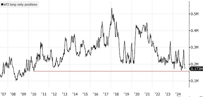 Чистые длинные позиции по нефти снизились до 14-летнего минимума. Источник: Bloomberg