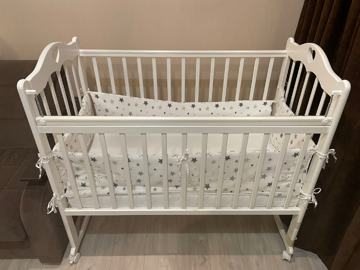 В данной статье хотел бы немного рассказать о нашей детской кроватке. Совсем недавно мы с ней попрощались, так как пришло время покупать новую, большего размера. Два с половиной года она служила нам верой и правдой. В продаже существует большое количество подобных кроваток, отличия, на мой взгляд, незначительные. Единственное более или менее серьезное отличие - это система укачивания. Бывают кроватки с маятниковой системой качания, в данной же модели она отсутствует. Сделана она из массива березы, окрашена в белый цвет. За время эксплуатации краска/лак нигде не слезала/слезал, но при этом в некоторых местах немного пожелтела. Размер спального места - 120х60см. Предназначена для сна малышей от 0 до 3-х лет. Мягкие бортики для кроватки удобно фиксировать. Наши бортики были на завязках, возможно имеются какие-то другие системы крепления, но нас вполне всё устраивало. Иногда они, конечно же, сминались по естественным причинам, но в целом отлично справлялись со своей функцией. Матрас и