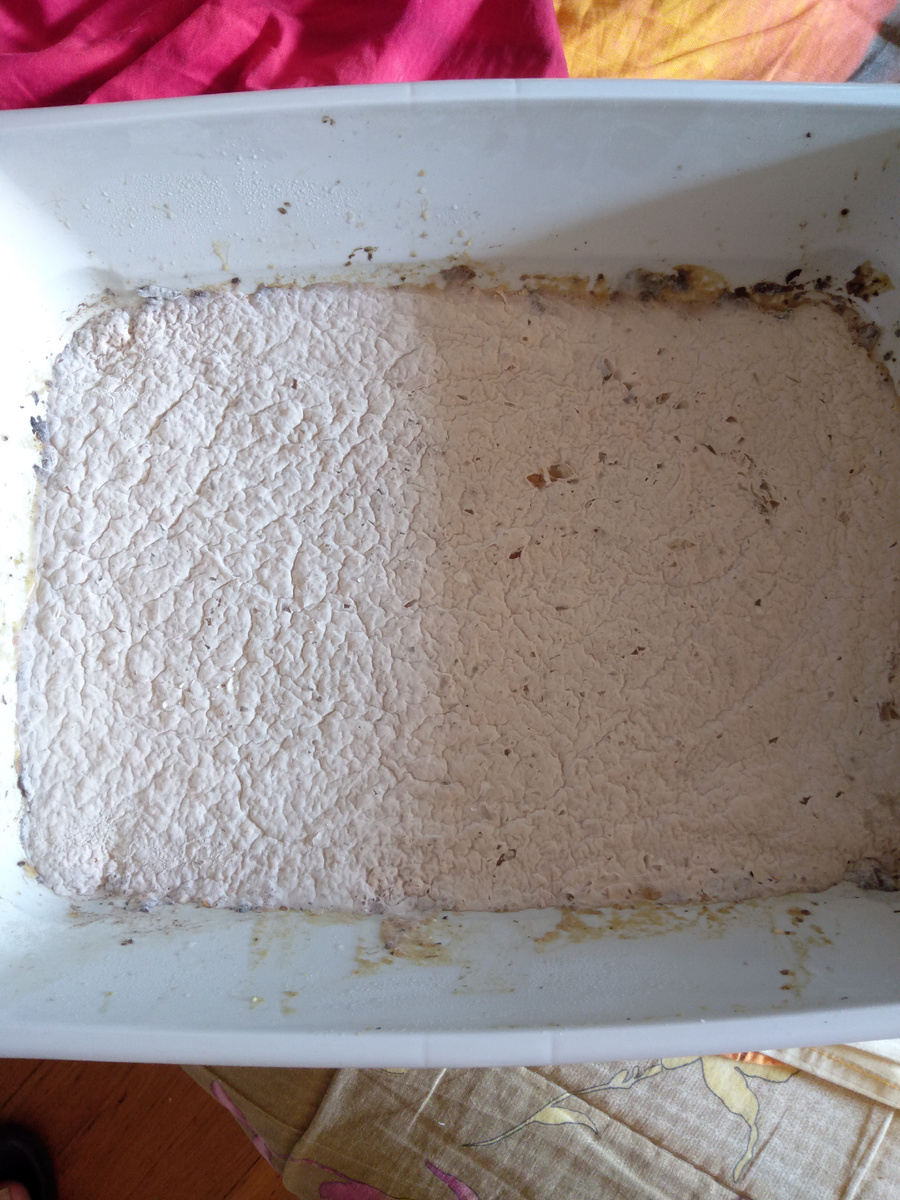 Всё просто-не уследил за кабаком, что стал "жидким" на 2/3. Решил скормить товарища, как есть, сенной палке. Прошлый борщевой набор пюре-очисток "пришкварился" к дну ёмкости так, что пришлось отмачивать и пересушивать. Потому-проложил дроблёной перловкой дно. Тухлый кабак проворил, слил всю жидкость из кастрюли и пробил в пюре горячим с добавлением предыдущей борщевой закваски в количестве 1 чл. (тут исходник). Пищевую соду решил заменить "голимой химией", т.е. щёлочью. Жаль, что точно не знаю какой был рН готового "варева ведьмы". Перловка дробленая на дно+пюре из тухлого кабака с закваской и "Кротом для чистки труб", еще и очисток свежих от картохи с паршой добавил, чтобы "зверя сеннопалочного натаскать" ...... Закрыл корыто пакетом прозрачным из Ашана для рыбы на 50+- литров и оставил на полу при комнатной температуре. Через сутки заметил, что пакет втянулся в ёмкость..... Открыл и...реально офигел....насколько палке понравились условия! Пакет втянулся, потому как палка выжрала пр