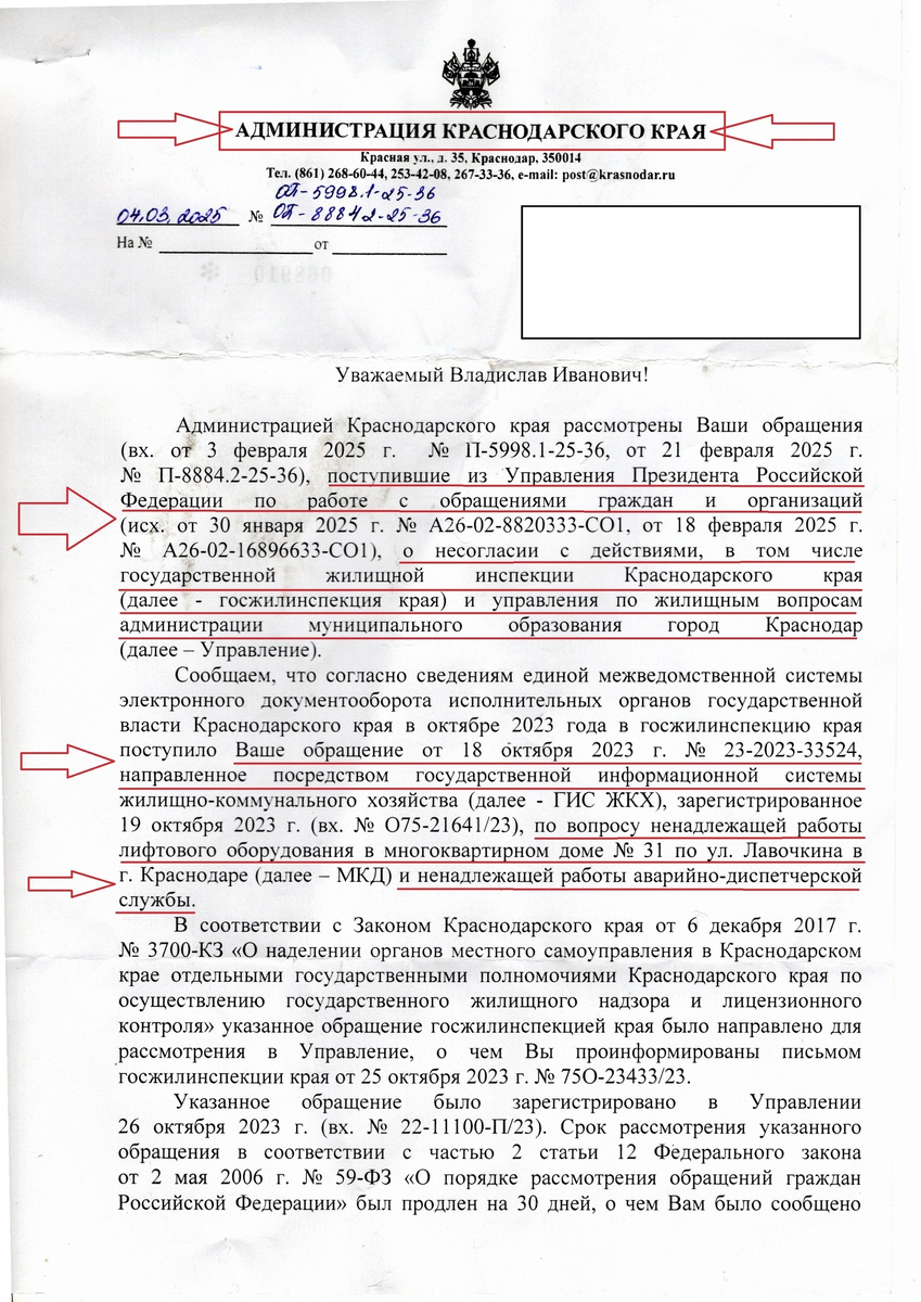 "Администрацией Краснодарского края рассмотрены Ваши обращения (вх. от 3 февраля 2025 г. № П-5998.1-25-36, от 21 февраля 2025 г. № П-8884.2-25-36), ‼поступившие из Управления Президента Российской Федерации по работе обращениями граждан и организаций‼ (исх. от 30 января 2025 г. № А26-02-8820333-СО1, от 18 февраля 2025 г. A26-02-16896633-CO1), о несогласии с действиями, государственной жилищной, в том числе, инспекции Краснодарского края (далее - госжилинспекция края) и управления по жилищным вопросам администрации: муниципального образования город Краснодар (далее - Управление).
