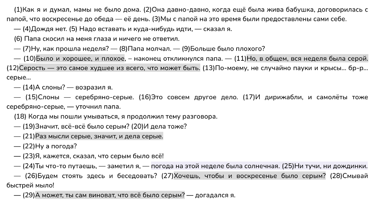 Сочинение по тексту Юза Алешковского «Как я и думал, мамы не было дома..». Вариант 21 сборника ФИПИ-2025 (50 вариантов под редакцией Дощинского) Как обстоятельства могут повлиять на эмоциональное состояние человека? Над этим вопросом предлагает задуматься Юз Алешковский. Рассказчик передаёт разговор с папой, который признаётся, что его неделя была «серой». Хотя на протяжении последних дней случалось и хорошее, и плохое, хотя погода стояла солнечная, мысли и дела мужчины были тусклыми, бесцветными. Герой признаётся: «Серость — это самое худшее из всего, что может быть». Становится ясно, что папа пребывал не в лучшем расположении духа, так как он был занят рутинными делами и не испытывал ярких эмоций. Однако далее рассказчик вместе с отцом отправляется на Птичий рынок. Там их окружает «пёстрая толпа» людей и всевозможных питомцев: рыбок, кроликов, голубей... Мальчик «светился от счастья и кивал головой» в ответ на вопросы папы, а тот признался сыну, что для него «мир расцвёл» и стал к