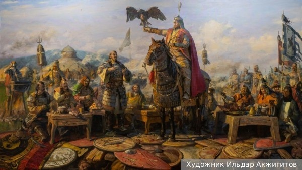 Современный татарский художник Ильдар Акжигитов (Белый Джигит, а "джиг" или "джуг", это "еврей") изобразил этот пир на картине, которая вызвала скандал. Русские обиделись. А чего обижаться? Поражение при Калке должно быть уроком от бахвальства и шапкозакидательства, а так же серьёзному отношению к военному делу и к предательству.