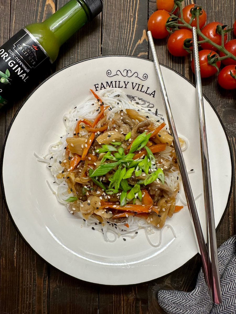 Рисовая лапша с вешенками и овощами в азиатском стиле, можно в пост