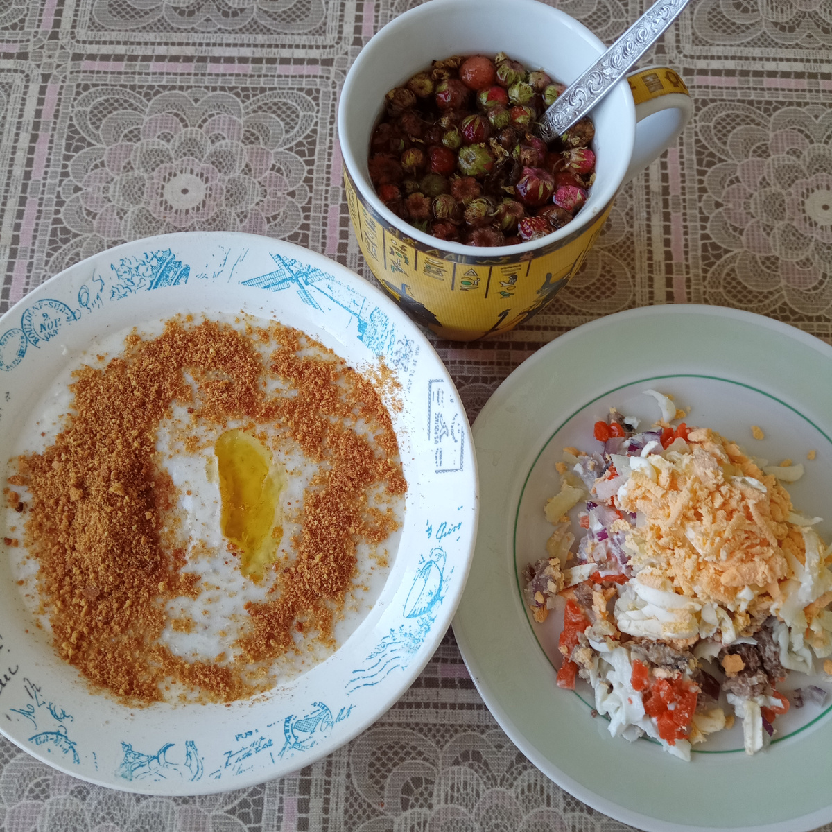 09.03.25. Воскресенье Так и хочется сказать, что начались будни, а сегодня ведь воскресенье. На пенсии без разницы, какой день недели. Я замечаю их только благодаря детям и внукам. Потому что надо с кем-то посидеть, кого-то забрать из гимназии или из садика. А сегодня никуда не надо идти, значит у меня выходной и он просто совпал с воскресеньем. Проснулась в 7.00. Выспалась. На улице явно некомфортно. Ветер так и свищет через форточку. Что-то он надует опять. Сварила овсяную кашу, люблю добавлять в кашу масло топлёное, так намного приятнее есть. Добавила сверху крошку от медового торта. Не пропадать же добру, надо её как-то использовать. Салат мимоза не сильно пропитан майонезом, поэтому так рассыпался. Но мне майонез лишний ни к чему. Это такая моя мера майонеза в салате и мне она нравится. Ну и, конечно, напиток с ягодой. Я её интенсивно сейчас поедаю. Жалко выкидывать. Там ещё лежит в заморозке несколько контейнеров. И почему никто не хочет её есть, я не понимаю. Ну и ладно, мне б