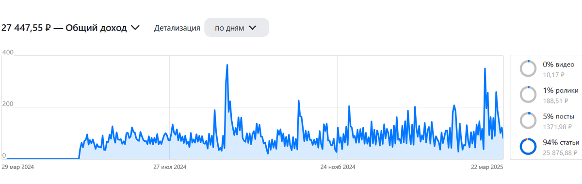 Вот и пролетел первый год на Дзене. Первая моя публикация была 30 марта 2024 года. Да, прошло чуть больше года, но эта статья написана в марте) На монетизацию я вышла за 16 дней, что довольно быстро. Первый заработок за месяц на монетизации был 1200 рублей. С того времени он не сильно вырос, но кроме самой монетизации, можно ещё много на чём заработать (реферальные ссылки, реклама, Премиум канал). Через полтора месяца у меня уже было 700 читателей и 30-50 рублей в день с монетизации. Спустя полгода у меня стабильно выходило около 2500 в месяц. Статистика за год: Вот эти два скачка в графике, это максимум, сколько я получала в день - 364 рубля. В эти два дня у меня выходили статьи про увольнение, сначала из Триколора, потом из колл-центра по ремонту бытовой техники. За год на монетизации заработано около 27 тысяч. Правда график начинается только с мая, так как с марта по май я была оформлена как физ. лицо, а потом перешла на самозанятость и после смены типа заработка все данные обновили